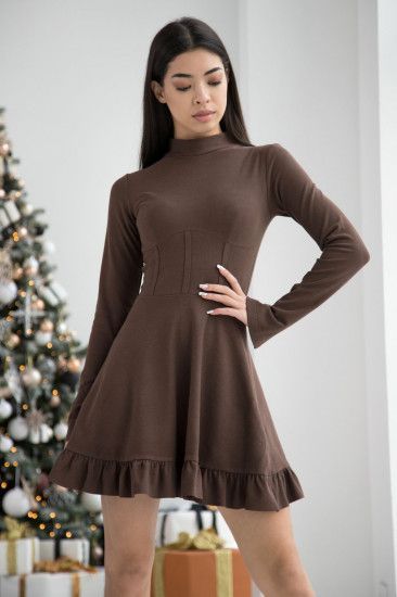 Нежное платье из теплого, приятного материала. На полке под грудью имитация корсета. Юбка расклешенная с рюшей по низу. Горловина обработана небольшой стойкой. По низу рукавов разрезы. Длина платья по центру спинки 84 см, длина рукава 65 см.
